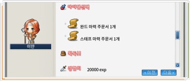 보상은 각 직업별 무기 주문서 10% 중 1개를 선택하고 20,000 경험치를 얻게됩니다.