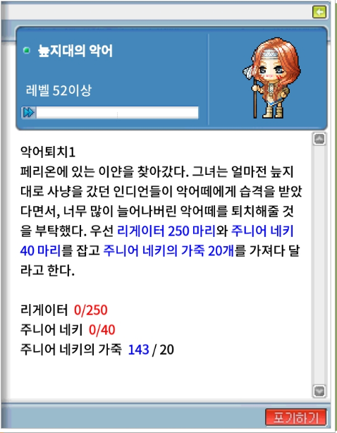 보시는 것처럼 주니어 네키의 가죽 20개와 리게이터, 주니어 네키를 처치하는 퀘스트입니다.