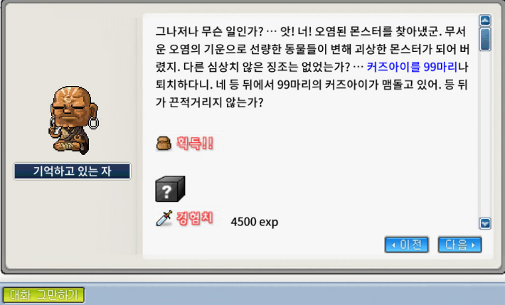 슬리피우드의 깊은숲사냥터2에서 커즈아이 수배표지판에서 퀘스트를 받을 수 있습니다.